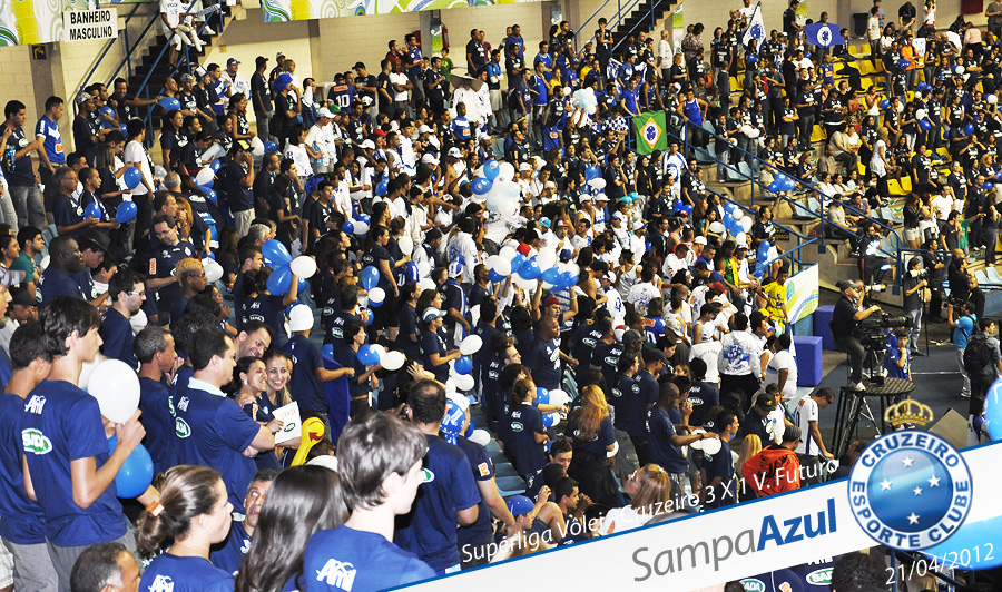 ‘Vou aonde você for, só para ver você jogar’. Foi com este espírito que mais de 50 amigos da Sampa Azul e outros tantos cruzeirenses de MG e de outras partes do Brasil compareceram a São Bernardo do Campo para a decisão da Super Liga de Vôlei. Compareceram para dividir ao meio o ginásio com a torcida do adversário paulista, o Vôlei Futuro.